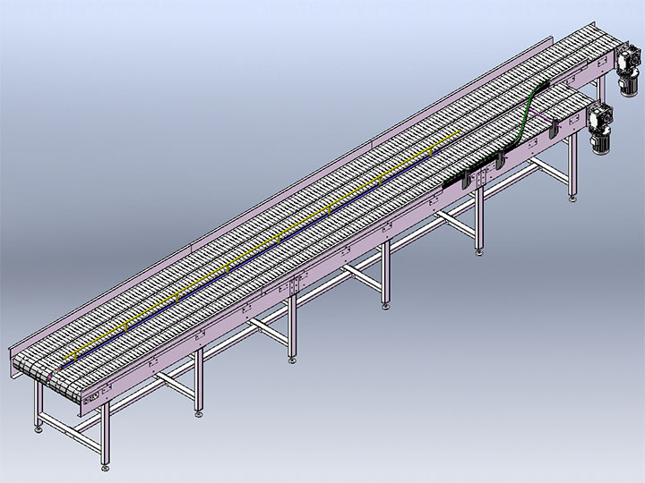 鏈板輸送機(jī)是一種以標(biāo)準(zhǔn)鏈板為承載面,由馬達(dá)減速機(jī)為動力傳動的傳送裝置。鏈板式輸送機(jī),由動力裝置(電機(jī))、傳動軸、滾筒、張緊裝置、鏈輪、鏈條、軸承、潤滑劑、鏈板等等構(gòu)成。其中帶動物料的輸送的主要的兩個(gè)部分為:鏈條,利用它的循環(huán)往復(fù)運(yùn)動提供牽引動力;金屬板,作為輸送過程中的承載體??梢酝ㄟ^多列鏈板并行,使鏈板輸送機(jī)做的很寬并形成差速,利用多列鏈板的速度差使多列輸送在無擠壓的情況下變?yōu)閱瘟休斔?,從而滿足飲料貼標(biāo)、灌裝、清洗等設(shè)備的單列輸送的要求,我們可以將兩條鏈板輸送機(jī)的頭尾部做成重疊式的混合鏈?zhǔn)沟闷浚ü蓿w處于動態(tài)過度狀態(tài),使輸送線上不滯留物料,可以滿足空瓶以及實(shí)瓶壓力和無壓力輸送。